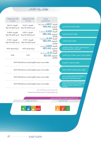 وثيقـــة الرؤيــة الأوليـــة 2 1مؤشــــرات الأداءبيانــاتخط الأساسالأداء المستهدفعام 2030الأداء المستهدفعام 2040وثيقـــة الرؤيــة الأوليـــةارتبــاط التوجهـات بأهـداف التنميـة المستدامـةارتبــاط مباشــر ارتبــاط غيــر مباشــرمؤشر التقدم االجتماعي مؤشر التنمية البشريةمؤشر تنمية الشبابمتوسط نصيب الفرد من الناتج المحلي اإلجمالي )باألسعار الثابتة( مؤشر مستوى المعيشة ً مؤشر تمكين الفئات األكثر احتياجامساهمة المجتمع المدني في الرفاه والحماية االجتماعيةفي المنافسات الرياضية اإلقليمية ُ العمانية التي تتوج بميداليات أو كؤوس ُ عدد الرياضيين العمانيين أو الفرق الرياضية والعالميةًمؤشر جديد سيتم تطويره وتحديد مستهدفاته الحقاًمؤشر جديد سيتم تطويره وتحديد مستهدفاته الحقاًمؤشر جديد سيتم تطويره وتحديد مستهدفاته الحقاًمؤشر جديد سيتم تطويره وتحديد مستهدفاته الحقاالقيمة: 2.68( من 0 إلى 100)التصنيف: 66/146)2018 )القيمة: 821.0( من 0 إلى 1)التصنيف: 48/189)2018 )القيمة: 611.0( من 0 إلى 1)التصنيف: 99/183)2016 )ُ مانيالقيمة: 6264 ريال عالتصنيف: 49/187)2017 )القيمة < 27.76أو من أفضل 40 دولةالقيمة < 871.0أو من أفضل 30 دولةالقيمة < 717.0أو من أفضل 40 دولةزيادة بنسبة @القيمة < 76.86أو من أفضل 20 دولةالقيمة < 908.0أو من أفضل 20 دولة القيمة < 737.0أو من أفضل 30 دولةزيادة بنسبة معامل جيني )مسح نفقات ودخل األسر(1القيمة: 31.0( من 1 إلى 0)التصنيف: 23/82)2010)31.0 28.01 كلما انخفضت قيمة معامل جيني كلما كان األداء أفضليقاس اإلنجاز في املؤشرات الدولية بتحقيق القيمة أو التصنيف27