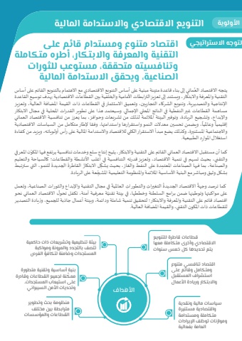 التنويع االقتصادي واالستدامة الماليةاقتصاد متنوع ومستدام قائم على التقنية والمعرفة واالبتكار، أطره متكاملة وتنافسيته متحققة، مستوعب للثورات الصناعية، ويحقق االستدامة الماليةُماني إلى بناء قاعدة متينة مبنية على أساس التنويع االقتصادي مع االهتمام بالتنويع القائم على أساس يتجه االقتصاد العالتقنية واملعرفة واالبتكار، ويستند إلى تعزيز الترابطات األمامية والخلفية بين القطاعات االقتصادية بهدف توسيع القاعدة اإلنتاجية والتصديرية، وتنويع الشركاء التجاريين، وتعميق االستثمار في القطاعات ذات القيمة املضافة العالية، وتعزيز مساهمة القطاعات غير النفطية في الناتج املحلي اإلجمالي. وسيعتمد هذا على تطوير القدرات املحلية في مجال االبتكار واإلبداع، وتشجيع الريادة، وتوفير البيئة املالئمة لذلك من تشريعات وحوافز، بما يعزز من تنافسية االقتصاد العماني ً، ويضمن تحسين معدالت النمو واستقرارها واستدامتها، وفقا إلطار متكامل من السياسات االقتصادية ً وعاملياإقليمياواالجتماعية املستنيرة، وكذلك يضع مبدأ االستقرار الكلي لالقتصاد واالستدامة املالية على رأس أولوياته، ويزيد من كفاءة استغالل املوارد الطبيعية.ّ ن املعرفي كما أن مستقبل االقتصاد العماني القائم على التقنية واالبتكار، يتيح إنتاج سلع وخدمات تنافسية يرتفع فيها املكووالتقني، بحيث تسهم في تنمية االقتصاد، وتعزيز قدرته التنافسية في أغلب األنشطة والقطاعات؛ كالسياحة والتعليم َ للنمو، التي سترتبط َ الجديدةُ القاطرةِل االبتكارِّ عة على الريادة. ِ والصناعة، بما فيها الصناعات املعتمدة على النفط والغاز، بحيث يشكّبشكل وثيق ومباشر مع البنية األساسية املالئمة واملنظومة التعليمية املشجَ في مجال التقنية واإلبداع والثورات الصناعية، وتعمل ُ ِ التغيرات والتطور ِ ات العامليةُ االقتصاد الجديدة كما ترصد وجهةّة معرفية آمنة، تكفل تحول االقتصاد العماني نحو على مواكبتها وتوطينها ضمن برامج السلطنة وخططها، في بيئة تقنياقتصاد قائم على التقنية واملعرفة واالبتكار؛ لتحقيق تنمية شاملة ودائمة، وبيئة أعمال جاذبة للجميع، وزيادة التصدير للقطاعات ذات املكون التقني، والقيمة املضافة العالية.قطاعات قاطرة للتنويعالاقتصادي وأخرى متكاملة معهايتم تحديدها كل خمس سنواتبيئة تنظيمية وتشريعات ذات حاكميةتتصف بالتجدد والمرونة ومواكبةالمستجدات وضامنة لتكافؤ الفرصاقتصاد تنافسي متنوعومتكامل وقائم علىاستشراف المستقبلوالابتكار وريادة الأعمالبنية أساسية وتقنية متطورةّ ممكنة لجميع القطاعات وقادرةعلى استيعاب المستجدات،وتحديات الأمن السيبرانيسياسات مالية ونقديةواقتصادية مستنيرةمتكاملة ومستدامةوموازنات توظف الإيراداتالعامة بفعاليةمنظومة بحث وتطويرمترابطة بين مختلفالقطاعات والمؤسساتالأهدافاألولويةلتوجه االستراتيجي