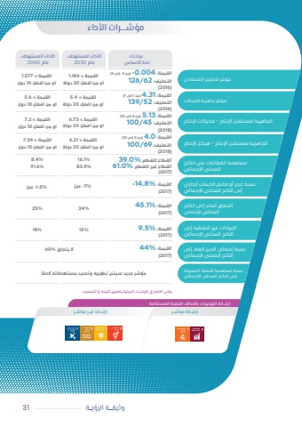 وثيقـــة الرؤيــة الأوليـــة 2 1مؤشــــرات الأداءبيانــاتخط الأساسالأداء المستهدفعام 2030الأداء المستهدفعام 2040وثيقـــة الرؤيــة الأوليـــةارتبــاط التوجهـات بأهـداف التنميـة المستدامـةارتبــاط مباشــر ارتبــاط غيــر مباشــر31مؤشر التطوير االقتصادي نسبة عجز أو فائض الحساب الجاري إلى الناتج المحلي اإلجمالي نسبة إجمالي الدين العام إلى الناتج المحلي اإلجمالياإلنفاق العام إلى الناتج المحلي اإلجمالياإليرادات غير النفطية إلى الناتج المحلي اإلجمالينسبة مساهمة اقتصاد المعرفة في الناتج المحلي اإلجمالي مساهمة القطاعات في الناتج المحلي اإلجمالي الجاهزية لمستقبل اإلنتاج - هيكل اإلنتاجالجاهزية لمستقبل اإلنتاج - محركات اإلنتاجمؤشر جاهزية الشبكاتالقيمة: 004.0( -من 3 -إلى 3)التصنيف: 62/126)2016 )القيمة: 31.4( من 1 إلى 7)التصنيف: 52/139)2016 )القيمة: 13.5( من 0 إلى 10)التصنيف: 45/100)2018 )القيمة: 0.4( من 0 إلى 10)التصنيف: 69/100)2018 )القطاع النفطي %0.39القطاع غير النفطي %0.61)2017 )القيمة: %8.14-)2017 ) -عجزالقيمة: %1.45)2017 )القيمة: %5.9)2017 )القيمة: D)2017 )ًمؤشر جديد سيتم تطويره وتحديد مستهدفاته الحقا%1.16%9.834 ال يتجاوز `%4.8%6.91%5.1 -عجز%القيمة < 4.5أو من أفضل 20 دولةالقيمة < 186.1أو من أفضل 20 دولةالقيمة < 73.6أو من أفضل 20 دولةالقيمة < 21.6أو من أفضل 20 دولةالقيمة < 6.5أو من أفضل 10 دولالقيمة < 577.1أو من أفضل 10 دول القيمة < 2.7أو من أفضل 10 دولالقيمة < 34.7أو من أفضل 10 دوليقاس اإلنجاز في املؤشرات الدولية بتحقيق القيمة أو التصنيف
