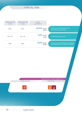 وثيقـــة الرؤيــة الأوليـــة 2 1مؤشــــرات الأداءارتبــاط التوجهـات بأهـداف التنميـة المستدامـةارتبــاط مباشــر ارتبــاط غيــر مباشــربيانــاتخط الأساسالأداء المستهدفعام 2030الأداء المستهدفعام 204033نسبة العمالة الماهرة من إجمالي العمالة في القطاع الخاصُ حصة القوى العاملة العمانية من إجمالي الوظائف المستحدثة في القطاع الخاص معدل نمو إنتاجية العمالةالقيمة: %9.57)2017 )القيمة: %2.1-)2017 )القيمة: %6.11)2016 )%1% - 25%2% - 3@