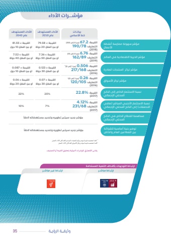 وثيقـــة الرؤيــة الأوليـــة 2 1مؤشــــرات الأداءبيانــاتخط الأساسالأداء المستهدفعام 2030الأداء المستهدفعام 2040وثيقـــة الرؤيــة الأوليـــةارتبــاط التوجهـات بأهـداف التنميـة المستدامـةارتبــاط مباشــر ارتبــاط غيــر مباشــر35مؤشر سهولة ممارسة أنشطة األعمالمؤشر تركز المنتجات الصادرةمؤشر الحرية االقتصادية في العالم مؤشر تركز األسواقنسبة االستثمار األجنبي المباشر )صافي التدفقات( إلى الناتج المحلي اإلجماليمساهمة القطاع الخاص في الناتج المحلي اإلجمالينسبة االستثمار الخاص إلى الناتج المحلي اإلجماليالقيمة: 2.67( من 0 إلى 100)التصنيف: 78/190)2018 )القيمة: 76.6( من 0 إلى 10)التصنيف: 89/162)2019 )القيمة: 506.0( من 1 إلى 0)2التصنيف: 168/217)2016 )القيمة: 26.0( من 1 إلى 0)3التصنيف: 105/120)2016 )القيمة: %8.22)2017 )القيمة: .4التصنيف: 68/231)2017 )ًمؤشر جديد سيتم تطويره وتحديد مستهدفاته الحقا%7%القيمة > 07.0أو من أفضل 30 دولةالقيمة > 123.0أو من أفضل 30 دولة"القيمة > 06.0أو من أفضل 20 دولةالقيمة > 087.0أو من أفضل 10 دول2 كلما انخفضت قيمة مؤشر تركز املنتجات الصادرة كلما كان األداء أفضل3 كلما انخفضت قيمة مؤشر تركز األسواق كلما كان األداء أفضلتوفير بنية أساسية للشراكة بين القطاعين العام والخاص ًمؤشر جديد سيتم تطويره وتحديد مستهدفاته الحقاالقيمة < 58.79أو من أفضل 20 دولةالقيمة < 36.7أو من أفضل 50 دولةالقيمة < 55.81أو من أفضل 10 دولالقيمة < 52.7أو من أفضل 40 دولةيقاس اإلنجاز في املؤشرات الدولية بتحقيق القيمة أو التصنيف
