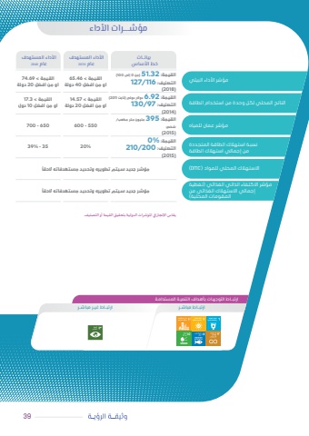 وثيقـــة الرؤيــة الأوليـــة 2 1مؤشــــرات الأداءارتبــاط التوجهـات بأهـداف التنميـة المستدامـةارتبــاط مباشــر ارتبــاط غيــر مباشــربيانــاتخط الأساسالأداء المستهدفعام 2030الأداء المستهدفعام 204039مؤشر األداء البيئيالناتج المحلي لكل وحدة من استخدام الطاقةمؤشر عمان للمياهنسبة استهالك الطاقة المتجددة من إجمالي استهالك الطاقةاالستهالك المحلي للمواد )DMC)مؤشر االكتفاء الذاتي الغذائي )تغطية إجمالي االستهالك الغذائي من المقومات المحلية(القيمة: 32.51( من 0 إلى 100)التصنيف: 116/127)2018 )القيمة < 46.65أو من أفضل 40 دولةالقيمة < 57.14أو من أفضل 20 دولة550 - 600 القيمة < 69.74أو من أفضل 20 دولةالقيمة < 3.17أو من أفضل 10 دول650 - 70035% - 39القيمة: 92.6 دوالر دولي )ثابت 2011)التصنيف: 97/130)2014 )القيمة: 395 مليون متر مكعب/شخص)2015)القيمة: %0التصنيف: 200/210)2015)ًمؤشر جديد سيتم تطويره وتحديد مستهدفاته الحقاًمؤشر جديد سيتم تطويره وتحديد مستهدفاته الحقايقاس اإلنجاز في املؤشرات الدولية بتحقيق القيمة أو التصنيف