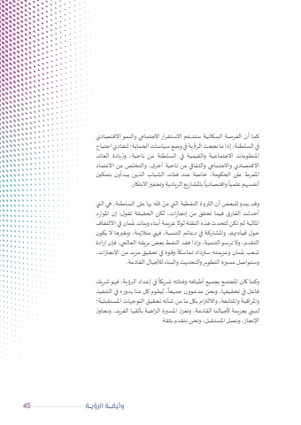 كما أن الفرصة السكانية ستدعم االستقرار االجتماعي والنمو االقتصادي في السلطنة، إذا ما نجحت الرؤية في وضع سياسات الحماية؛ لتفادي اجتياح املنظومات االجتماعية والقيمية في السلطنة من ناحية، وزيادة العائد االقتصادي واالجتماعي والثقافي من ناحية أخرى، والتخلص من االعتماد املفرط على الحكومة، خاصة عند فئات الشباب الذين يبدأون بتمكين ً باملشاريع الريادية وتحفيز االبتكار.ً واقتصادياأنفسهم علمياّ هللا بها على السلطنة، هي التي وقد يبدو للبعض أن الثروة النفطية التي منأحدثت الفارق فيما تحقق من إنجازات، لكن الحقيقة تقول: إن املوارد ُمان في االلتفاف املالية لم تكن لتحدث هذه النقلة لوال عزيمة أبناء وبنات عحول قيادتهم، واملشاركة في دعائم التنمية، فهي متالزمة، وبغيرها ال يكون التقدم، وال ترسو التنمية، وإذا فقد النفط بعض بريقه العالمي، فإن إرادة ً وقوة في تحقيق مزيد من اإلنجازات، ُمان وعزيمته ستزداد تماسكاشعب عوستواصل مسيرة التطوير والتحديث والبناء لألجيال القادمة.ً في إعداد الرؤية، فهو شريك وكما كان املجتمع بجميع أطيافه وفئاته شريكاً، ليقوم كل منا بدوره في التنفيذ فاعل في تحقيقها، ونحن مدعوون جميعاواملراقبة واملتابعة، وااللتزام بكل ما من شأنه تحقيق التوجهات املستقبلية؛ لنبني بعزيمة ألجيالنا القادمة، ونعزز املسيرة الزاهية بألقها الفريد، ونجاوز اإلنجاز، ونصل املستقبل، ونحن نتقدم بثقة. 45