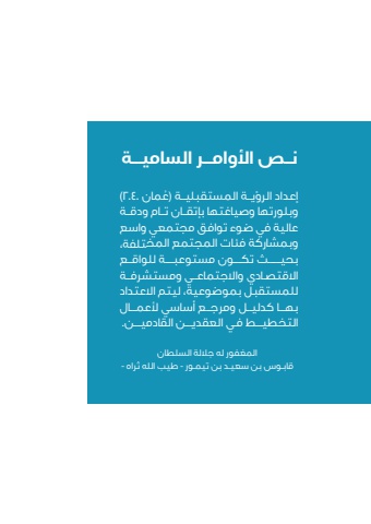 ُ إعداد الرؤية المستقبلية (عمان ٢٠٤٠(وبلورتها وصياغتها بإتقان تام ودقةعالية في ضوء توافق مجتمعي واسعوبمشاركة فئات المجتمع المختلفة،بحيث تكون مستوعبة للواقعالاقتصادي والاجتماعي ومستشرفةللمستقبل بموضوعية، ليتم الاعتدادبها كدليل ومرجع أساسي لأعمالالتخطيط في العقدين القادمين.المغفور له جلالة السلطانقابوس بن سعيد بن تيمور - طيب الله ثراه -نffffص الأوامffffffر الساميffffffة