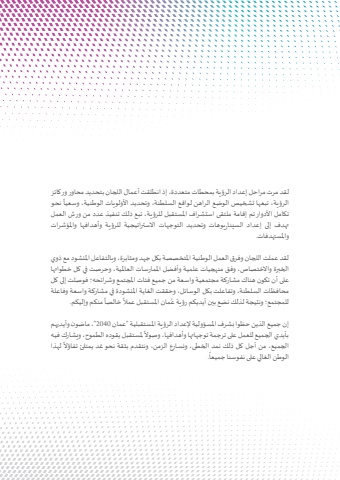 لقد مرت مراحل إعداد الرؤية بمحطات متعددة، إذ انطلقت أعمال اللجان بتحديد محاور وركائز ً نحو الرؤية، تبعها تشخيص الوضع الراهن لواقع السلطنة، وتحديد األولويات الوطنية، وسعياتكامل األدوار تم إقامة ملتقى استشراف املستقبل للرؤية، تبع ذلك تنفيذ عدد من ورش العمل تهدف إلى إعداد السيناريوهات وتحديد التوجهات االستراتيجية للرؤية وأهدافها واملؤشرات واملستهدفات. لقد عملت اللجان وفرق العمل الوطنية املتخصصة بكل جهد ومثابرة، وبالتفاعل املنشود مع ذوي الخبرة واالختصاص، وفق منهجيات علمية وأفضل املمارسات العاملية، وحرصت في كل خطواتها على أن تكون هناك مشاركة مجتمعية واسعة من جميع فئات املجتمع وشرائحه؛ فوصلت إلى كل محافظات السلطنة، وتفاعلت بكل الوسائل، وحققت الغاية املنشودة في مشاركة واسعة وفاعلة ً منكم وإليكم.ً خالصاُمان املستقبل عمالللمجتمع؛ ونتيجة لذلك نضع بين أيديكم رؤية عإن جميع الذين حظوا بشرف املسؤولية إلعداد الرؤية املستقبلية \عمان 2040 ،\ماضون وأيديهم ً ملستقبل يقوده الطموح، ويشارك فيه بأيدي الجميع للعمل على ترجمة توجهاتها وأهدافها، وصوالً لهذا الجميع، من أجل كل ذلك نمد الخطى، ونسارع الزمن، ونتقدم بثقة نحو غد يمتلئ تفاؤال.ًالوطن الغالي على نفوسنا جميعا